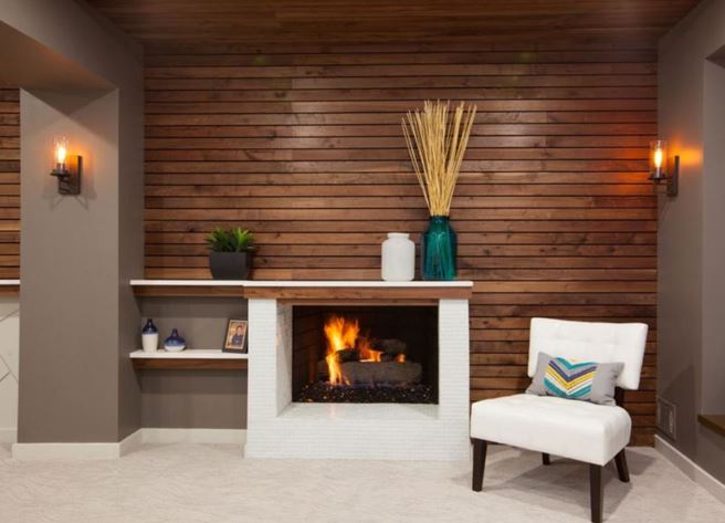 To give warm vibes in your basement, it is better to opt for wooden panel wall. Put an artificial plant on the table and armless sofa near your fireplace. A mini colorful pillow will beautify your guest collection fireplace. There is no rug in this idea.