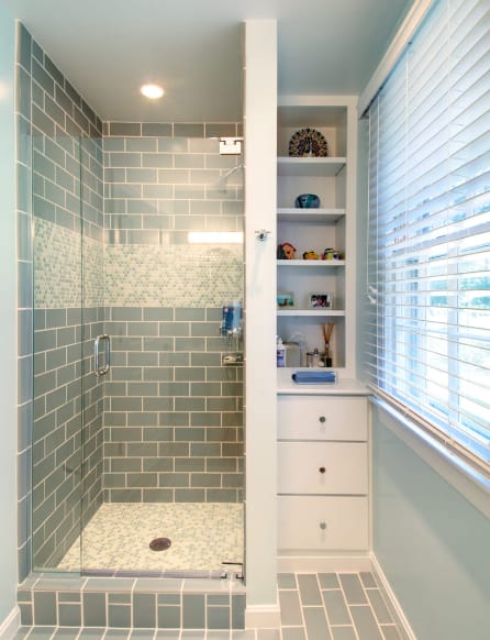 Extra storage is always welcome, particularly so in the bathroom. Instead of adding a cabinet, you can opt for a built-in shelf. A built-in shelf virtually doesn’t eat up the shower space. For the tiles, you can arrange them differently to add texture and depth.