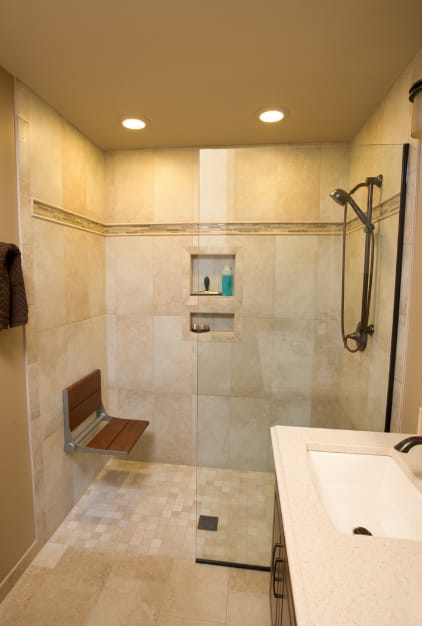 A door can make your shower feel cramped. If you have a small space, it is a good idea to go doorless. Install a glass panel to keep the water contained. Use a frame with a contrasting color to make the walk-in shower more appealing.