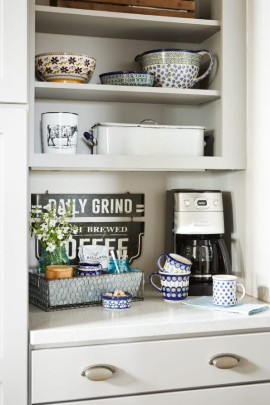 This tea station at home is well organized with pull-out shelves in a custom cabinet. The hidden shelving idea keeps your cups and saucers out of sight for a clean and tidy look on the white marble countertop. The shelves also create a perfect space to store your tea to maintain its flavor.