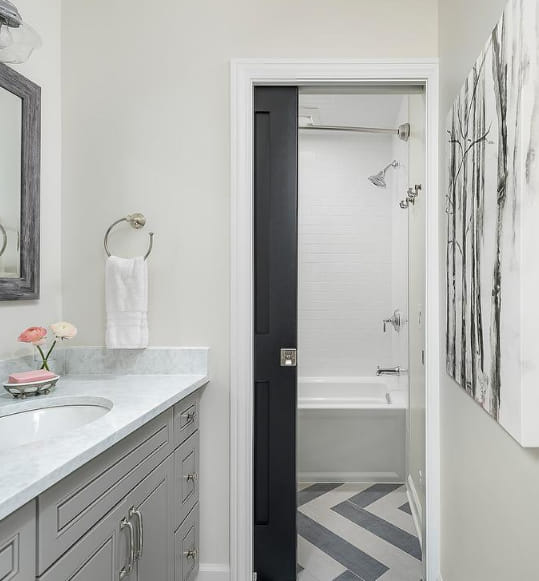 Pocket door is one of the types of bathroom door which is a more aesthetic choice. The door is hidden between the walls and it is a good option if you have a narrow bathroom. You don’t need more space, but it is not tightly closed. You need the proper design to have this door for the bathroom.