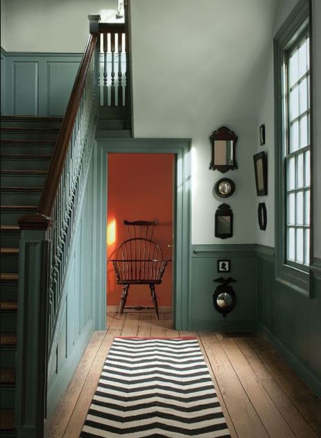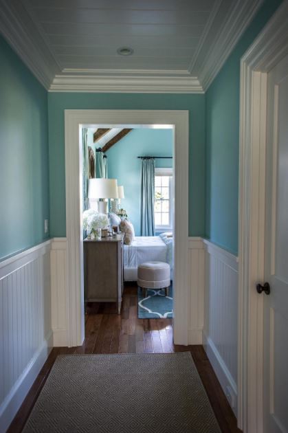 What about this light blue colored wall? Yes, it looks awesome with white colored wainscoting. This picture is a design of a hallway wall to get into the bedroom which has the same paint color on the wall.