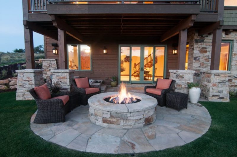 While many homeowners don’t really care about the shape of their walkout basement patios, this is among walkout basement patio ideas that pay extra attention on it. Natural stones are arranged into round shape and a round fire pit is added to the center.