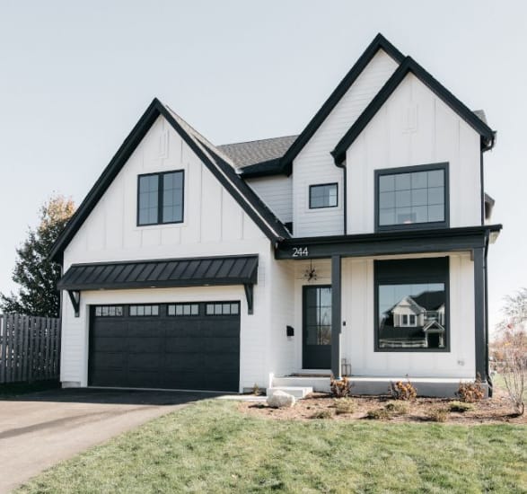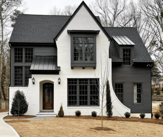 The house has white-colored dominance, where the black is the trim. However, the sides of the house are black for the upper parts.