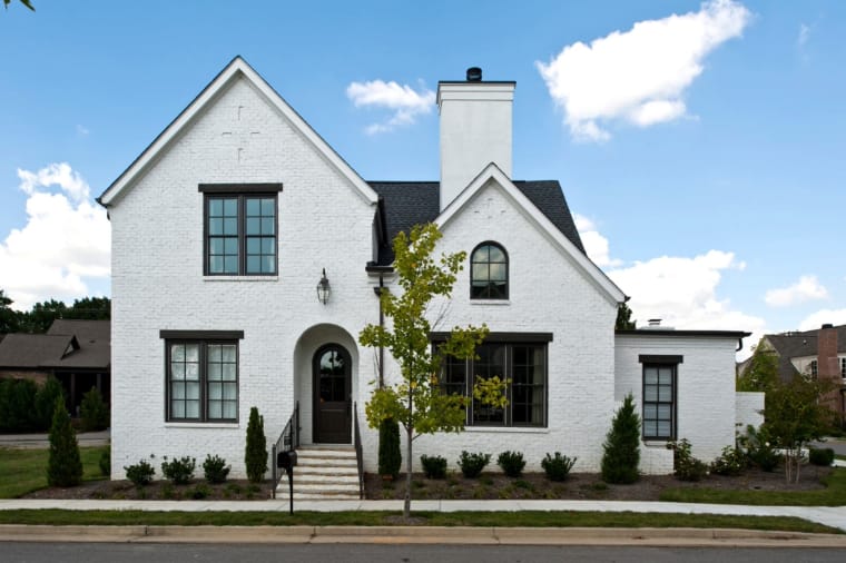 A traditional white house black trim has another level. The main materials of the house are white-painted bricks and metal frames for the window. The accent for the door is arched doors, but the windows are simply rectangular.