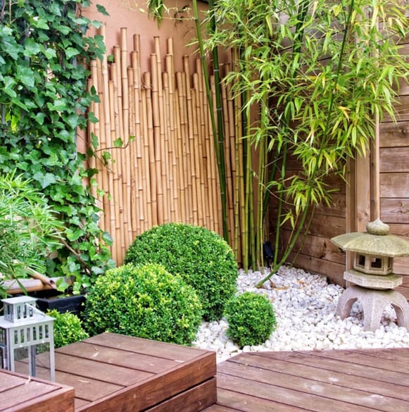 A zen garden is the most gorgeous idea for your backyard. To create a nice zen garden in your backyard, consider planting bamboo plants in front of a bamboo and wooden fencing combination.
