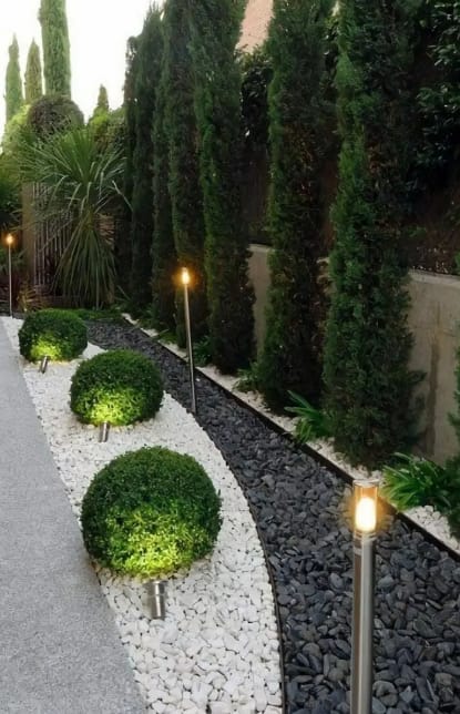 This is going to separate two different sections that combine perfectly because of the green shrubs between the white pebbles.