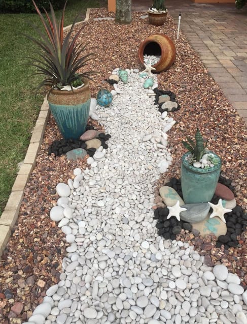 Create a unique river by using white pebbles. First of all, you need to cover the ground with brown pebbles and then place white pebbles in the middle to create a river.